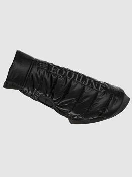 Черная куртка для собак из ткани с гламурным бархатным эффектом, очень теплая и удобная. Застежка-липучка и блестящая надпись Equiline на спине.