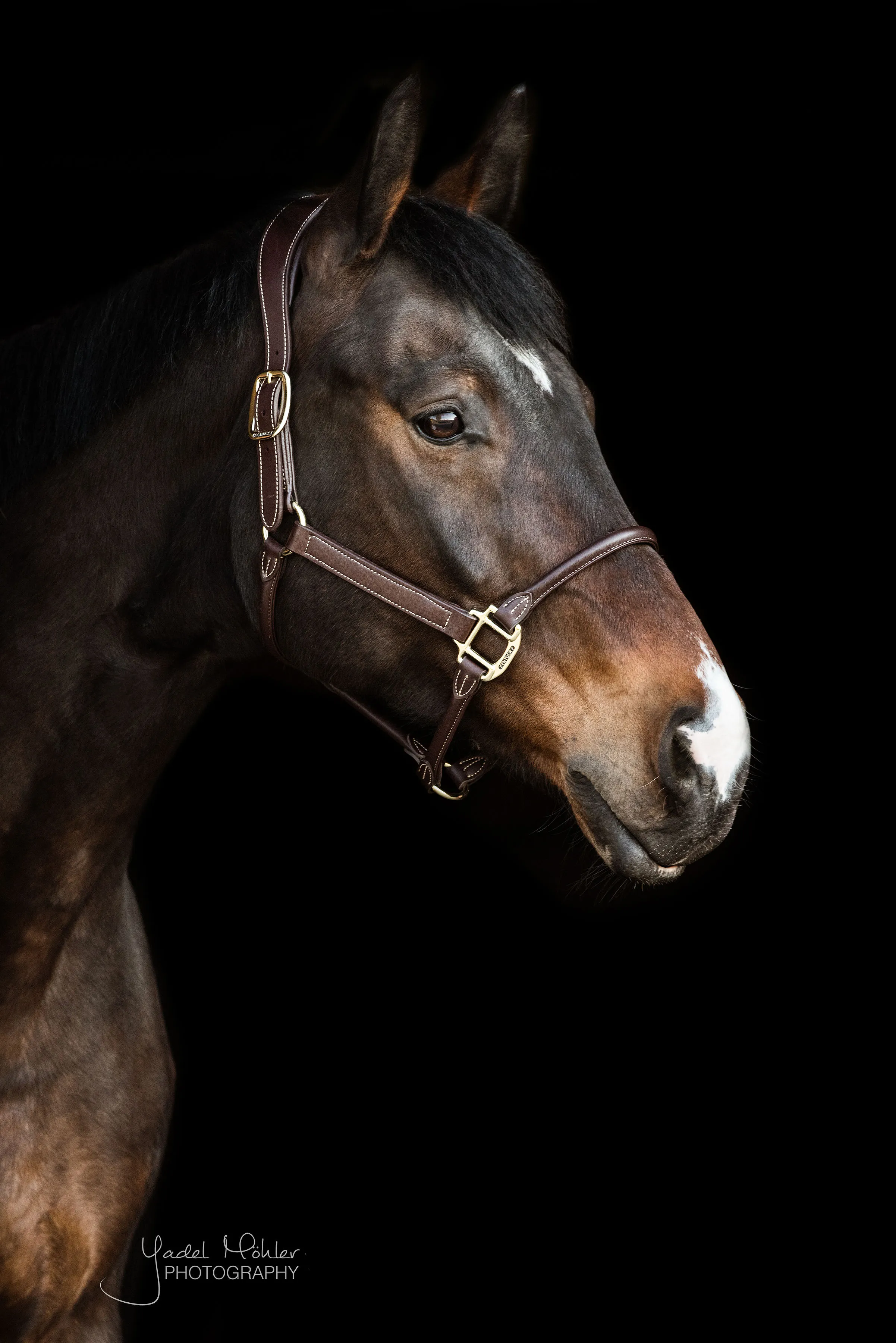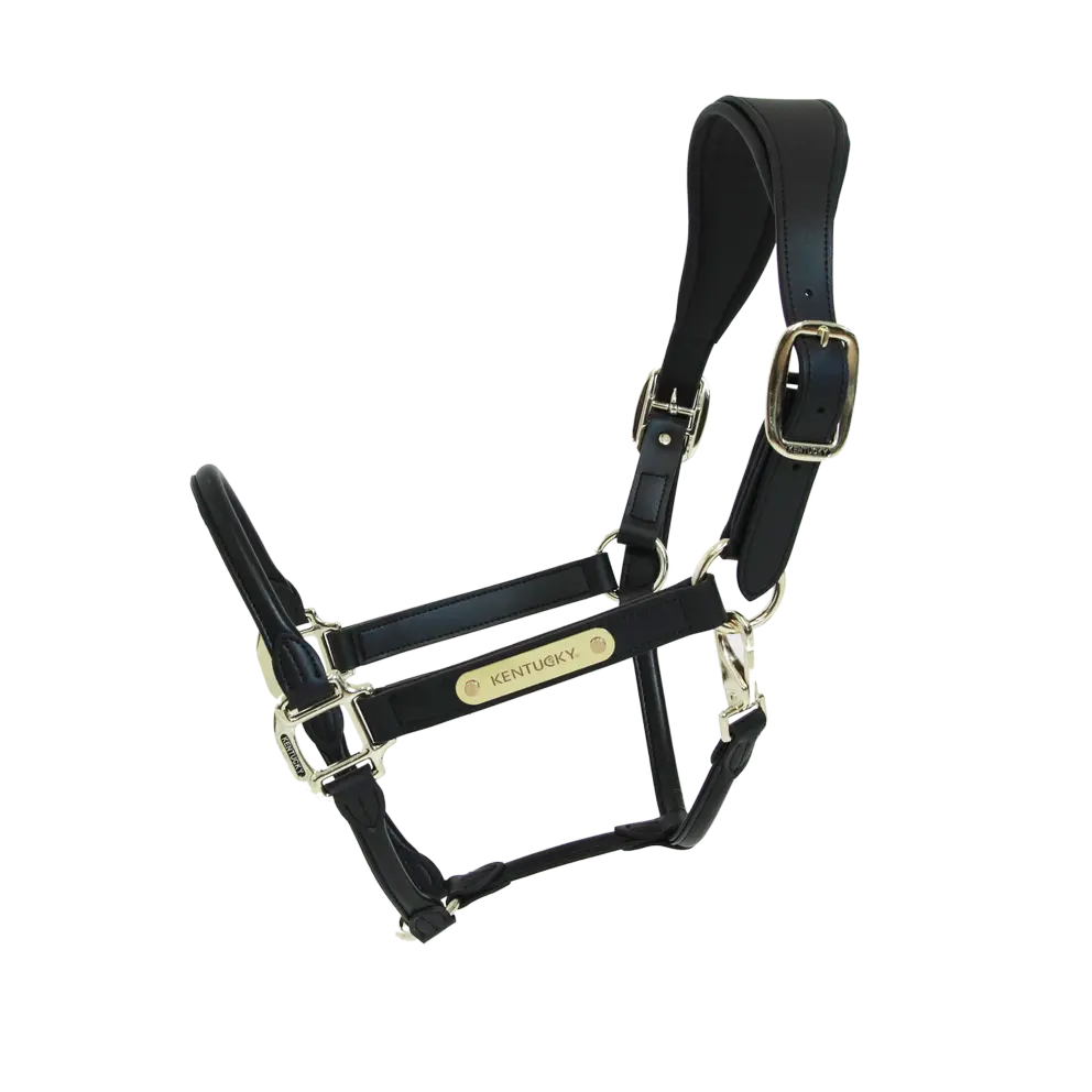 Все застежки золотистого цвета. Анатомический кожаный недоуздок украшен пластиной золотого цвета с выгравированным логотипом.