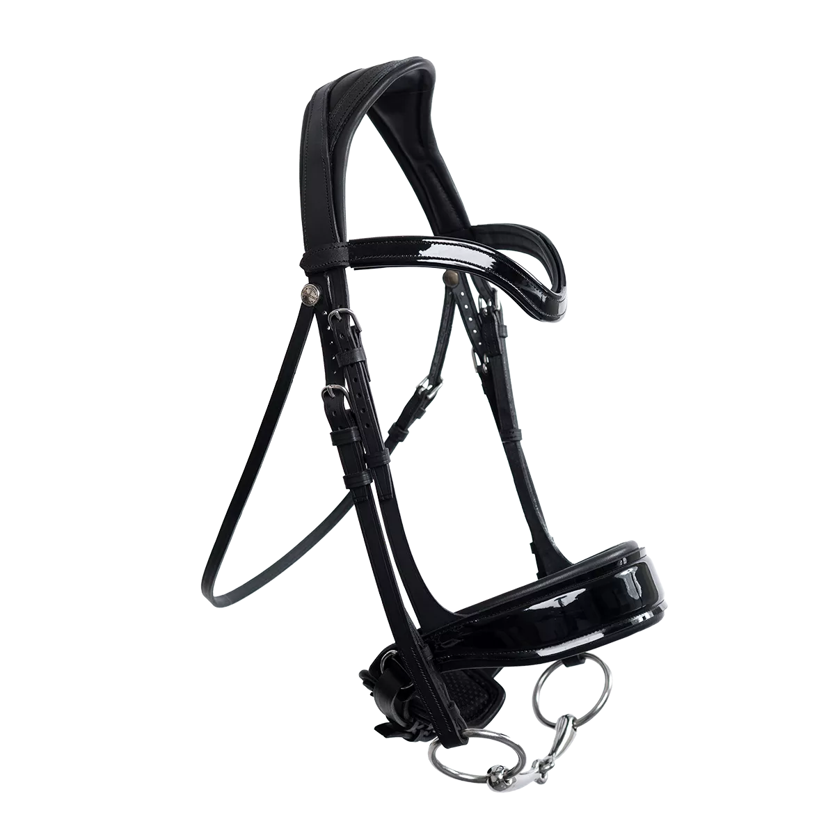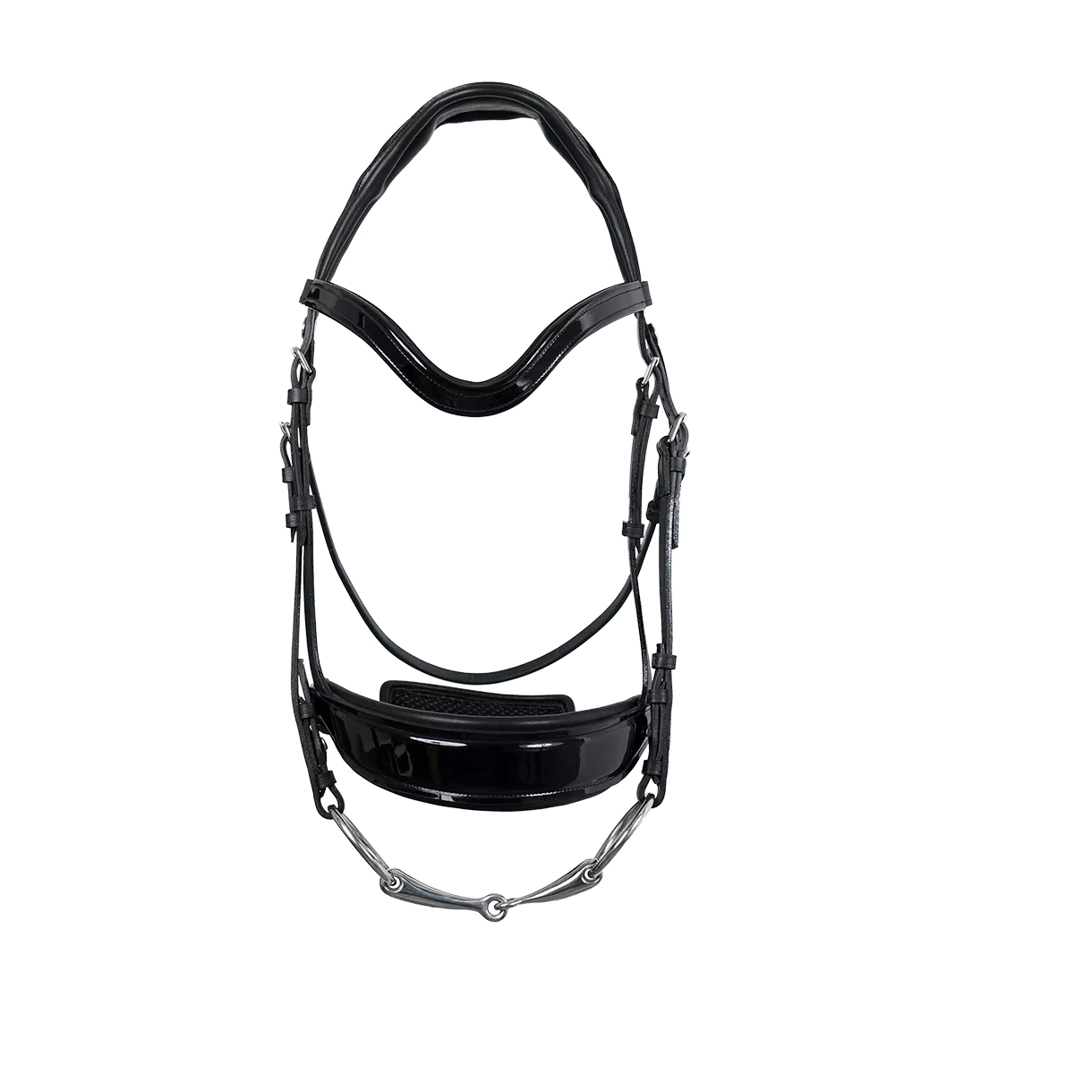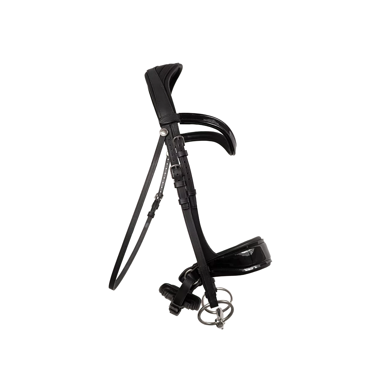 Блестящая трензельная уздечка Makila. Уздечка имеет отверстие на затылочном ремне для освобождения затылочной связки.