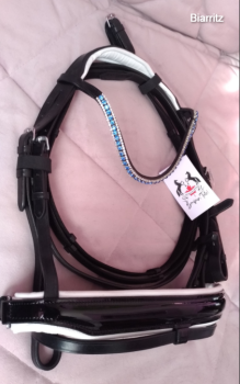 Роскошная лаковая уздечка Biarritz, из чёрной кожи с белой подложкой, капсуль самозатягивающийся, анатомический для лучшего расположения железа во рту лошади, налобник красивые стразы, затылочный ремень анатомический, в комплекте с поводьями!