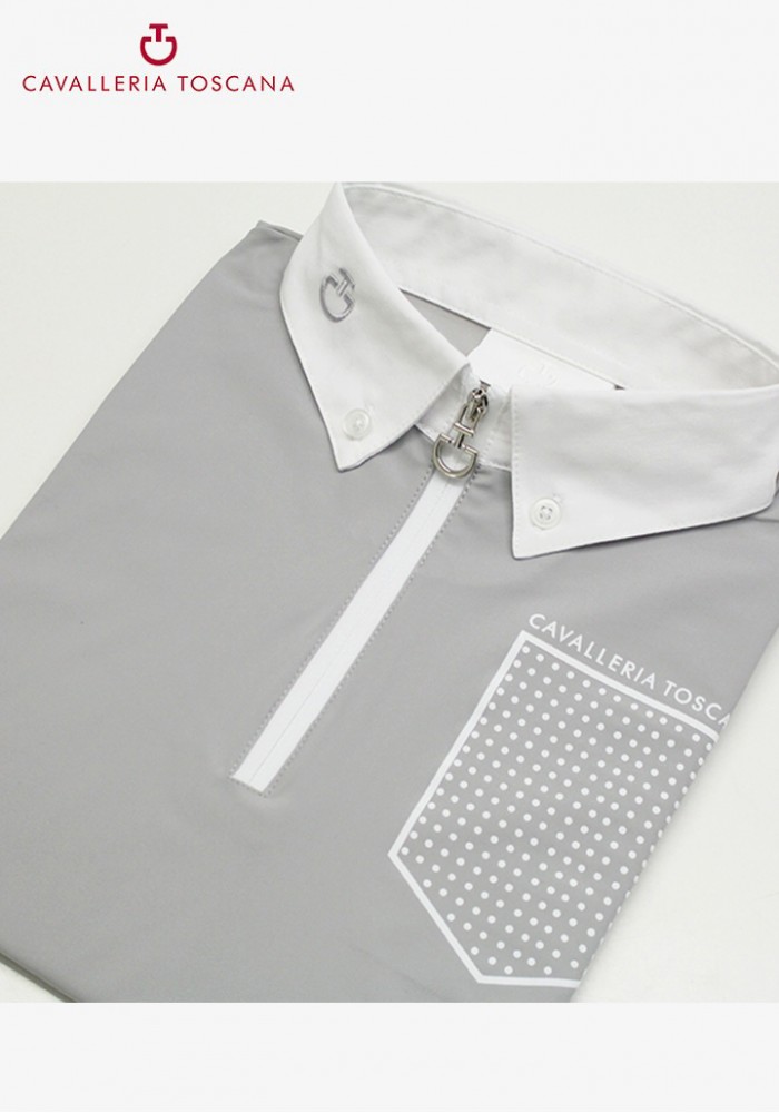 Рубашка-поло для соревнований с короткими рукавами в техническом 4-полосном стрейч-трикотаже сочетает в себе комфорт и функциональность. Дышащий, антибактериальный и быстросохнущий материал. Рубашка закрывается молнией, имеет белый стоячий воротник, который украшен небольшим вышитым логотипом.