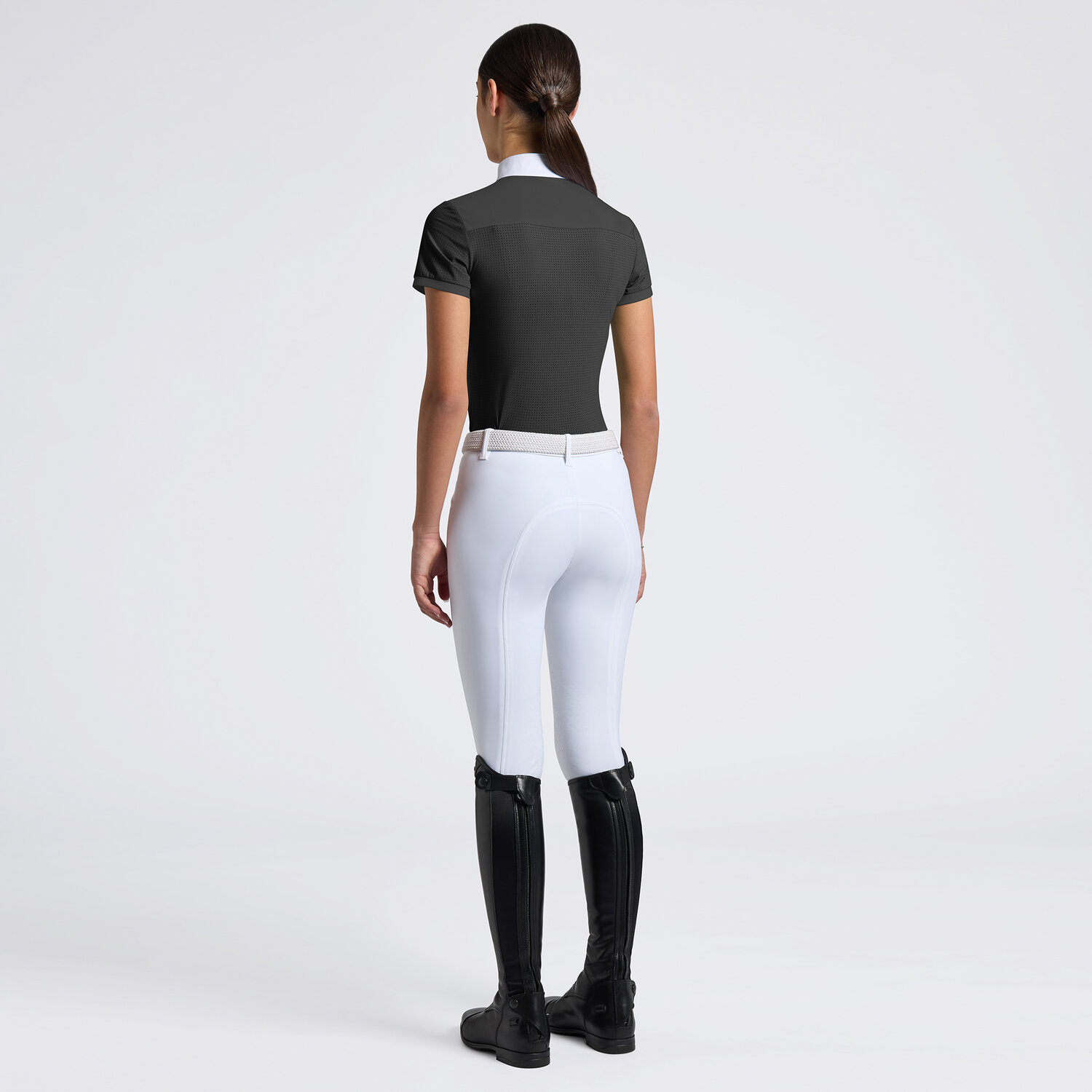 Поло для соревнований с короткими рукавами для девочек сочетает в себе функциональность и стиль, что делает модель идеальной для юных всадниц. Поло изготовлено из легкой ажурной трикотажной ткани, обеспечивает максимальную воздухопроницаемость и комфорт во время соревнований. Модель украшена элегантными перфорированными вставками и изысканным воротником со скрытыми пуговицами для сдержанного и утонченного образа.