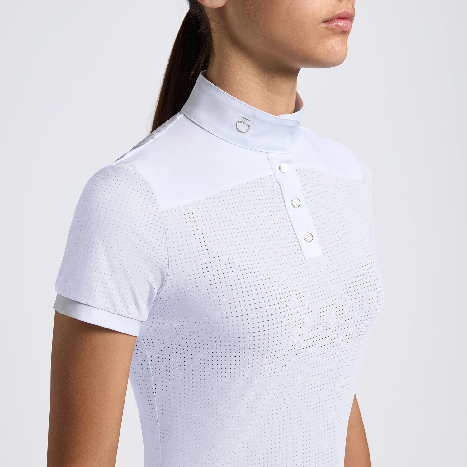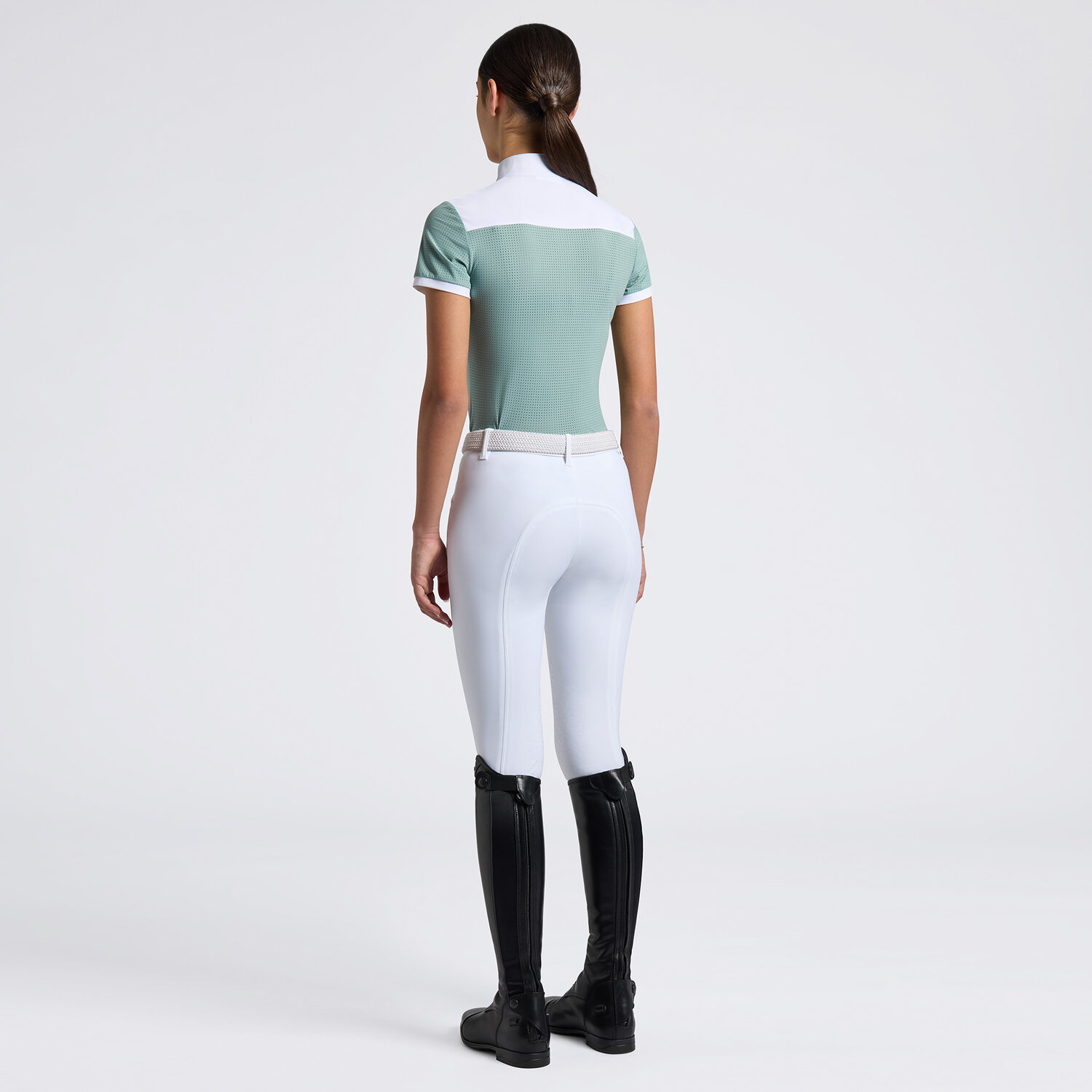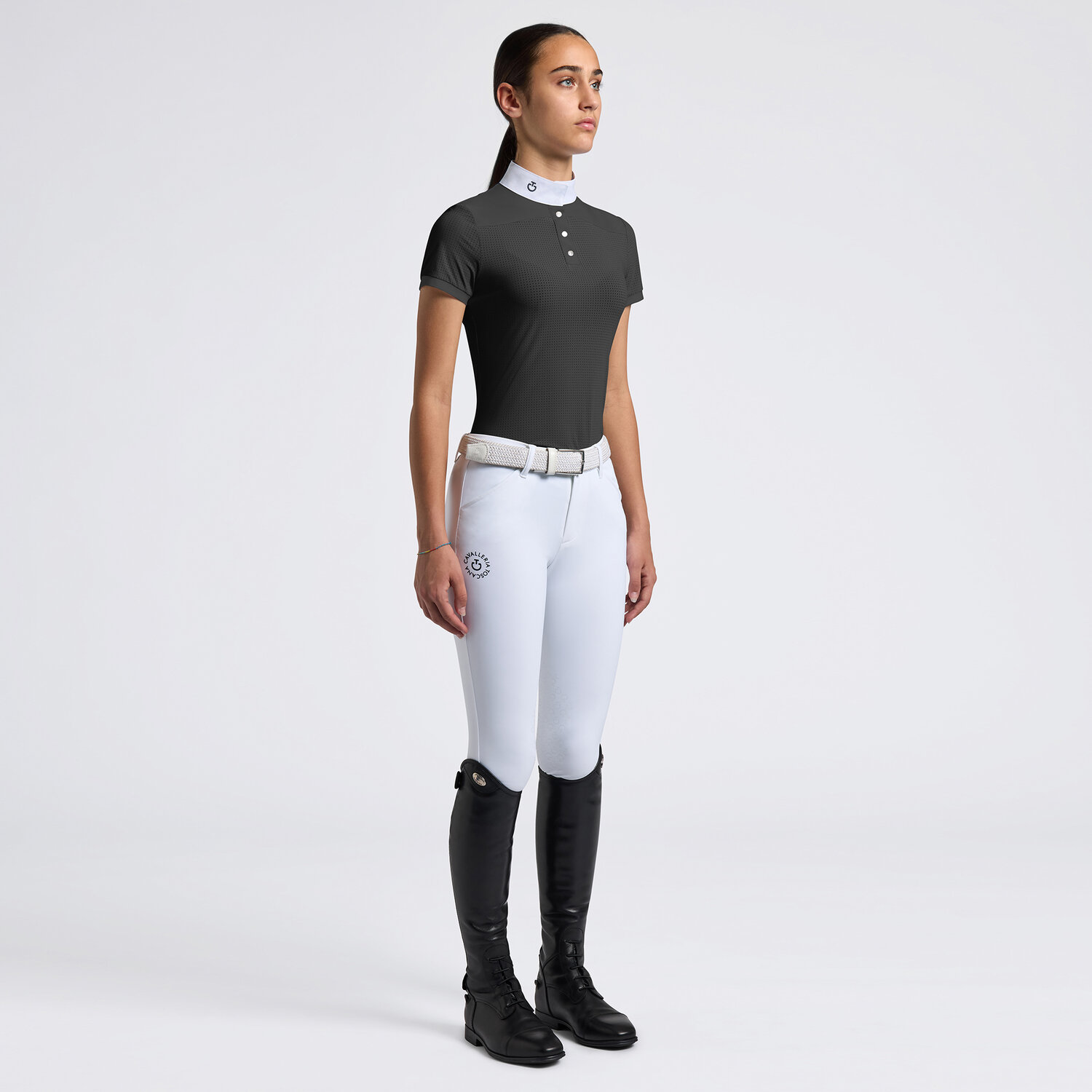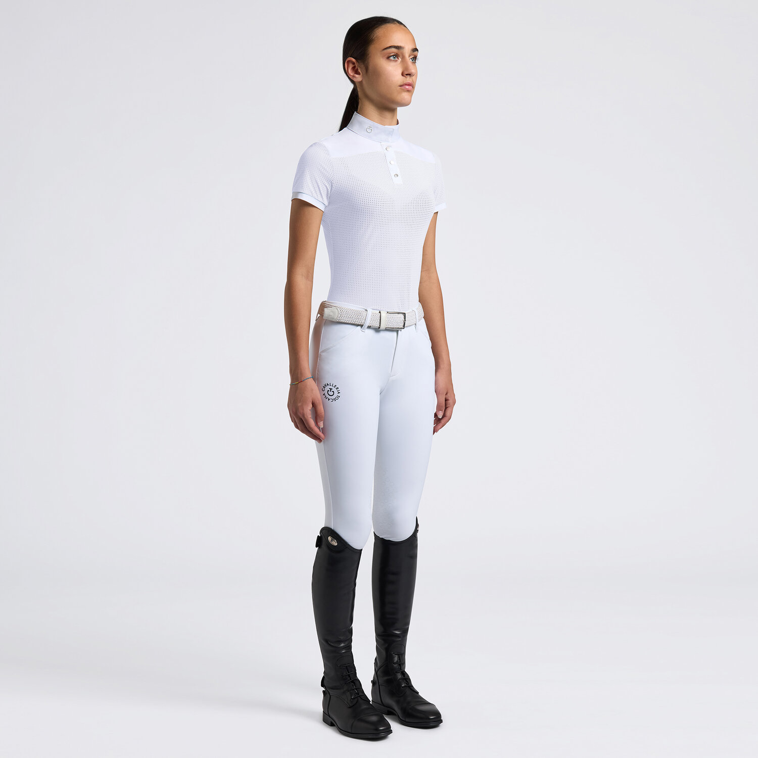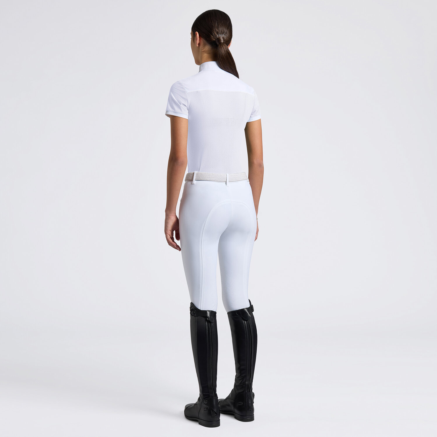 Поло для соревнований с короткими рукавами для девочек сочетает в себе функциональность и стиль, что делает модель идеальной для юных всадниц. Поло изготовлено из легкой ажурной трикотажной ткани, обеспечивает максимальную воздухопроницаемость и комфорт во время соревнований. Модель украшена элегантными перфорированными вставками и изысканным воротником со скрытыми пуговицами для сдержанного и утонченного образа.