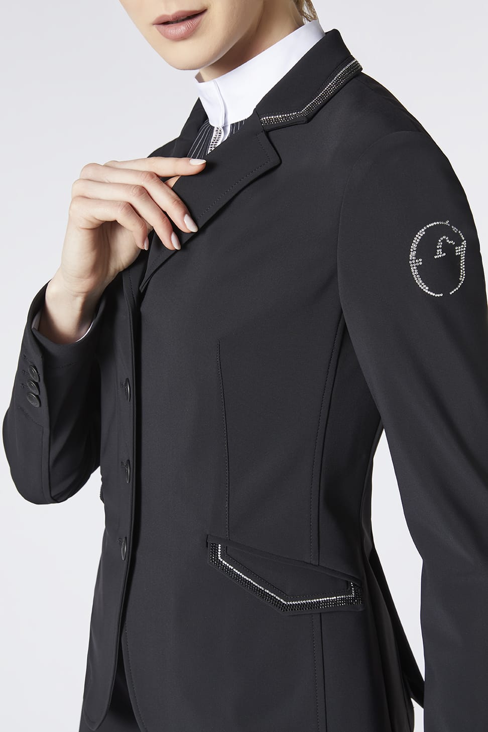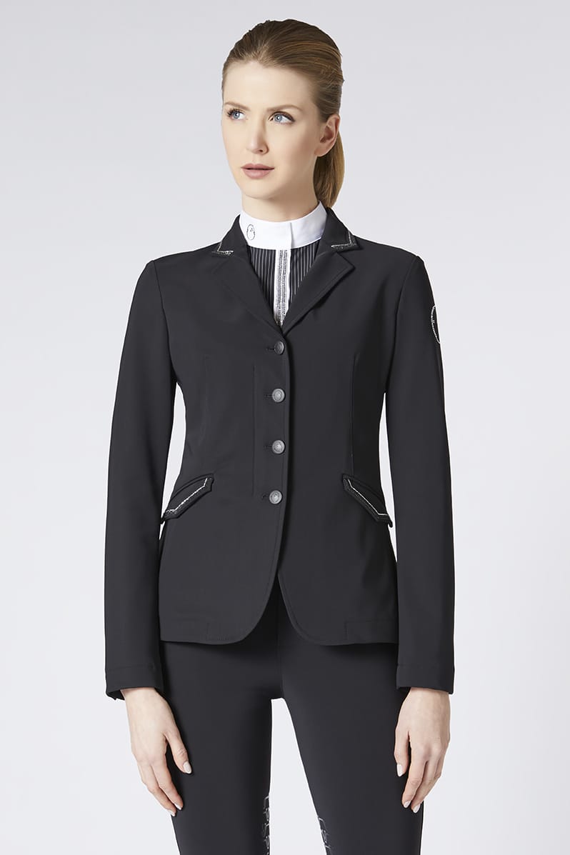 Эксклюзивный женский редингот Nizza украшен двухцветными мини-заклепками на воротнике и боковых карманах и одноцветными мини-заклепками на логотипе Vestrum на рукаве. Биэластичная ткань делает модель идеальной для соревнований. Они гарантируют свободу движений девушкам любого телосложения. Двойная застежка спереди на потайную молнию и 4 пуговицы с логотипом Vestrum.