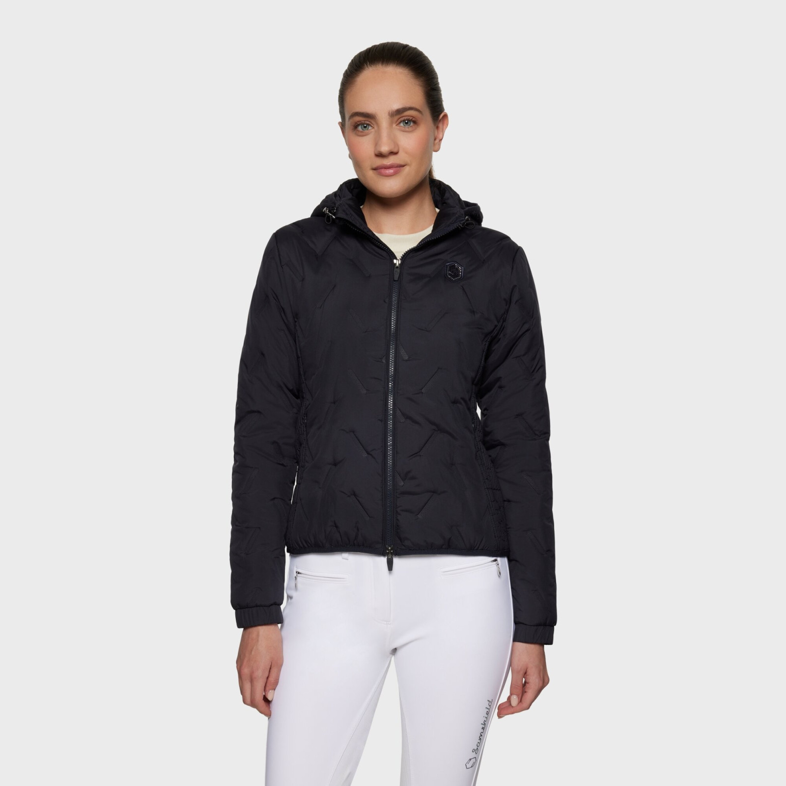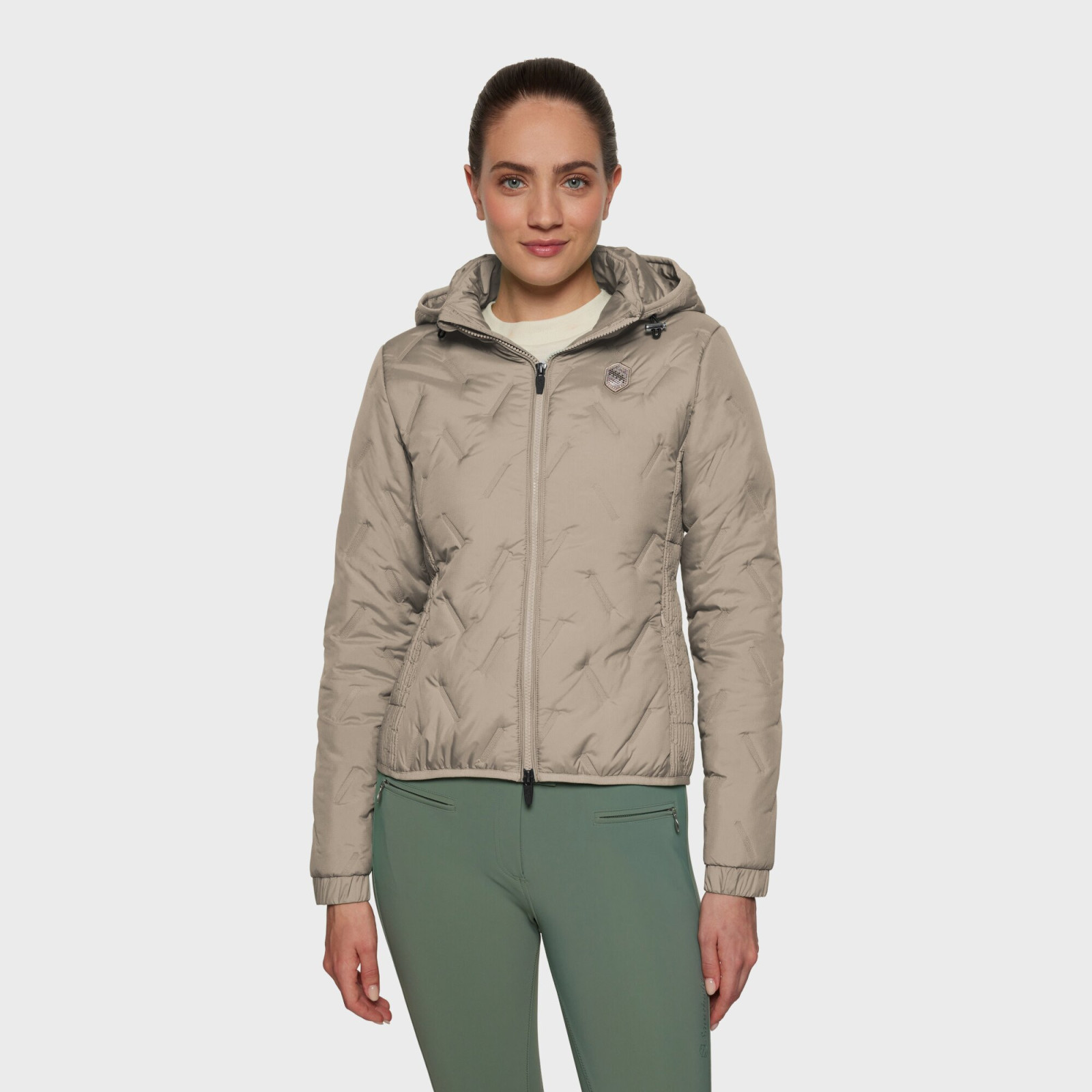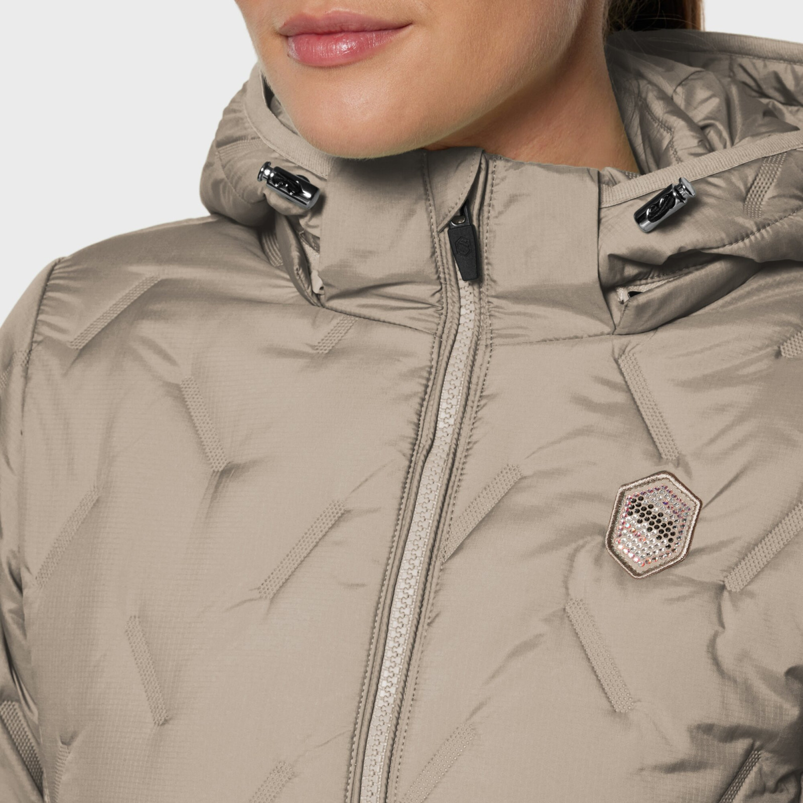 Изысканный дизайн с застежкой-молнией "тон в тон", невидимым карманом на молнии, съемным капюшоном и нашивкой Swarovski.