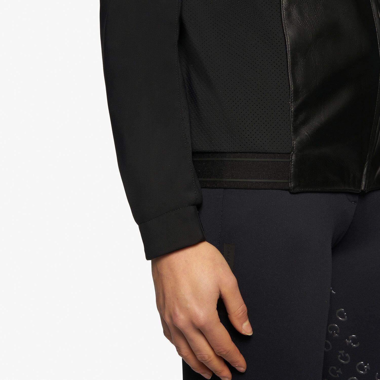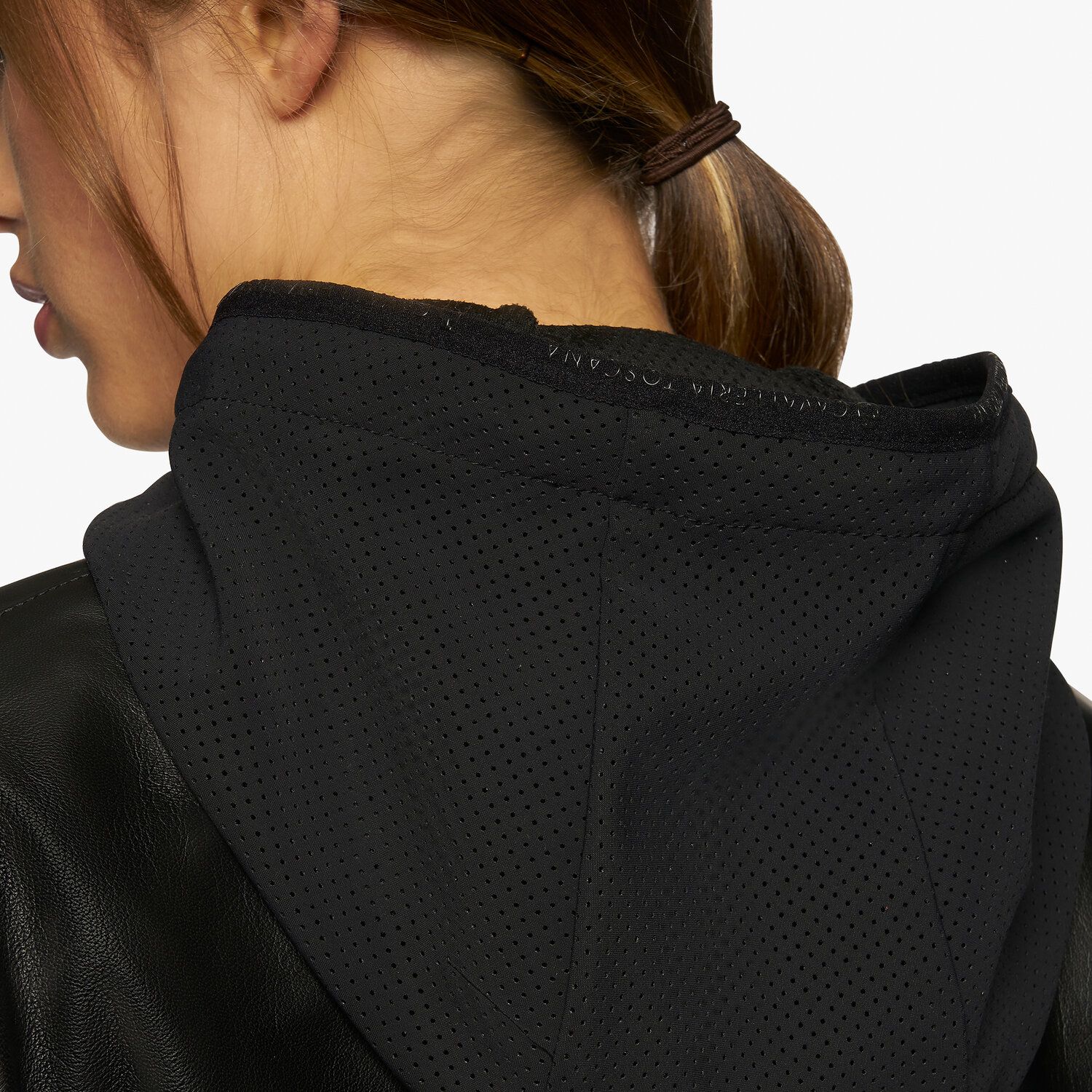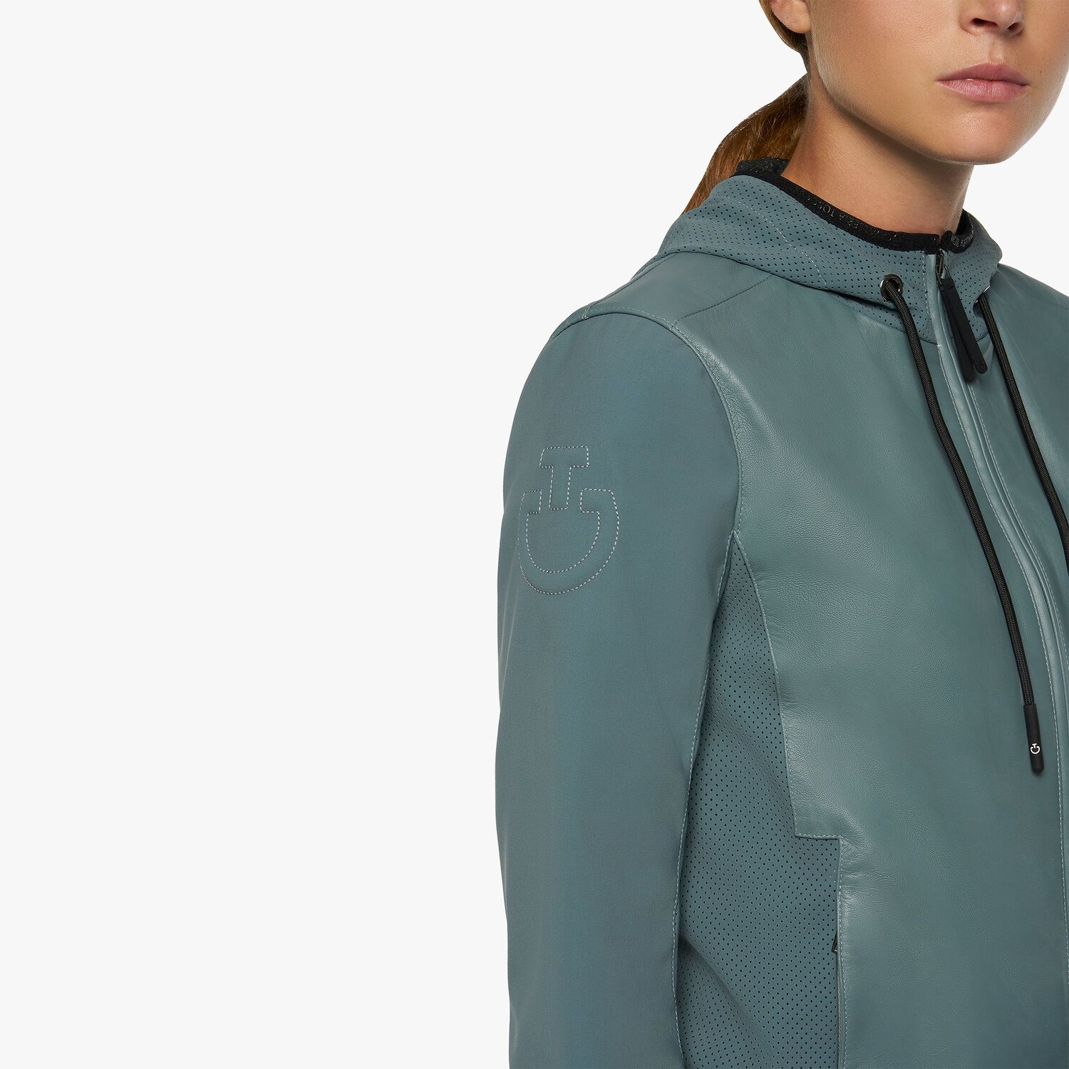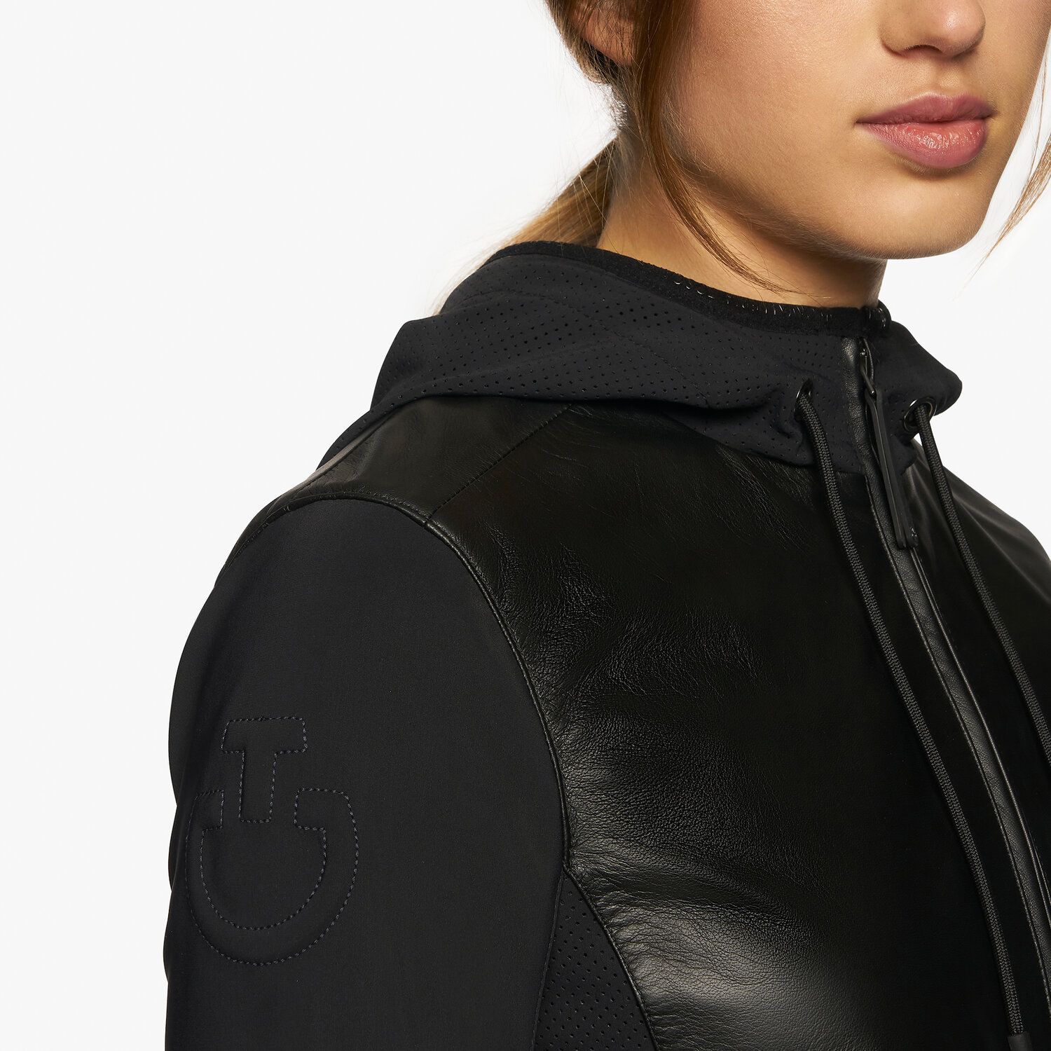 Модель выполнена из высококачественной кожи и детализирована перфорированным трикотажем по бокам, тем самым обеспечивая отличную воздухопроницаемость. Трикотажные рукава не сковывают движения, в то время как регулируемый капюшон с шнурком удобен для укрытия от ветра при езде.
