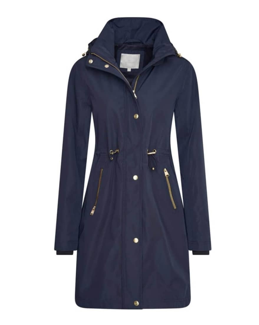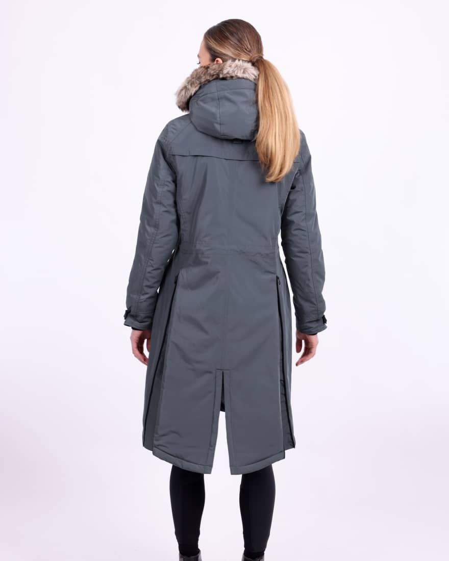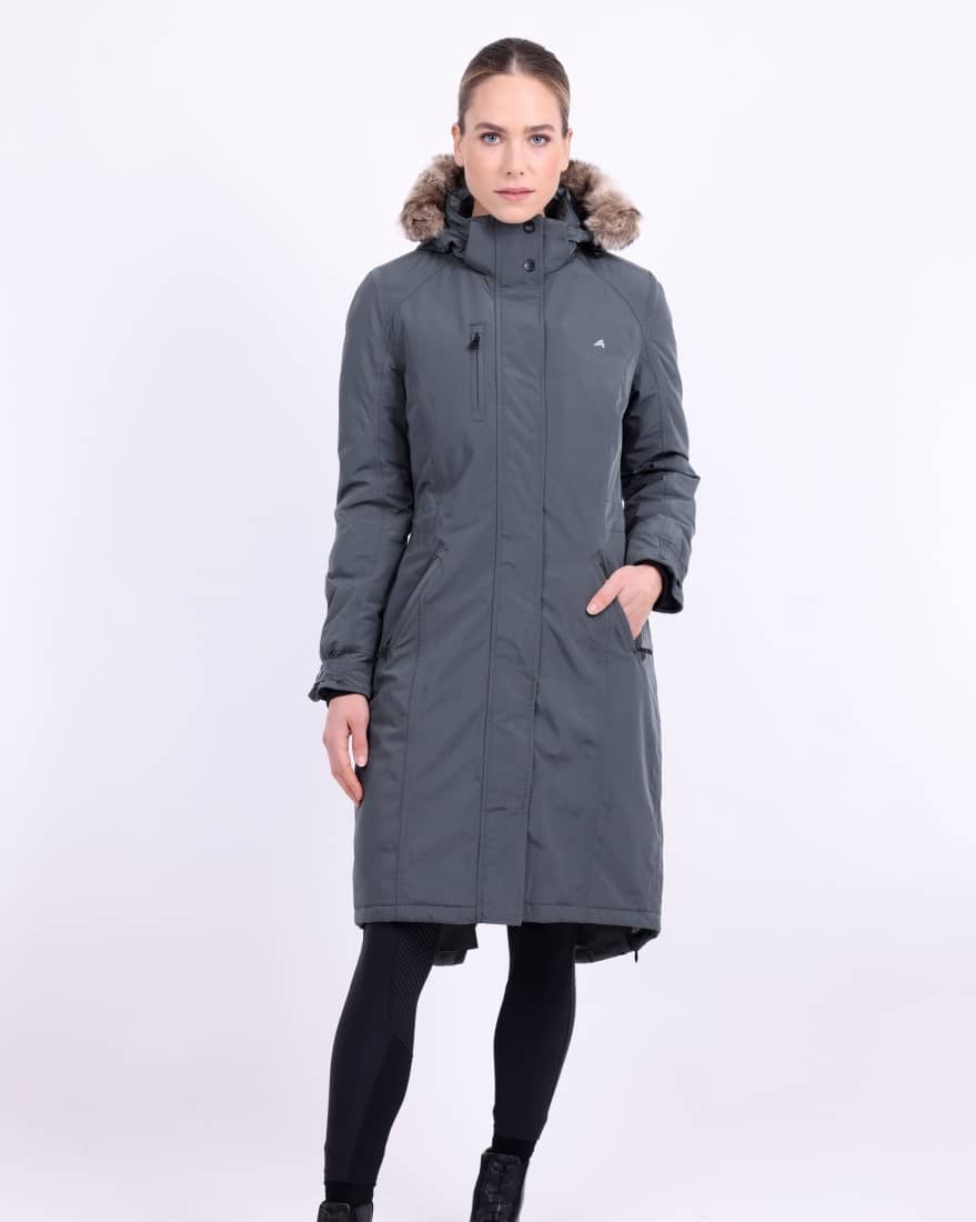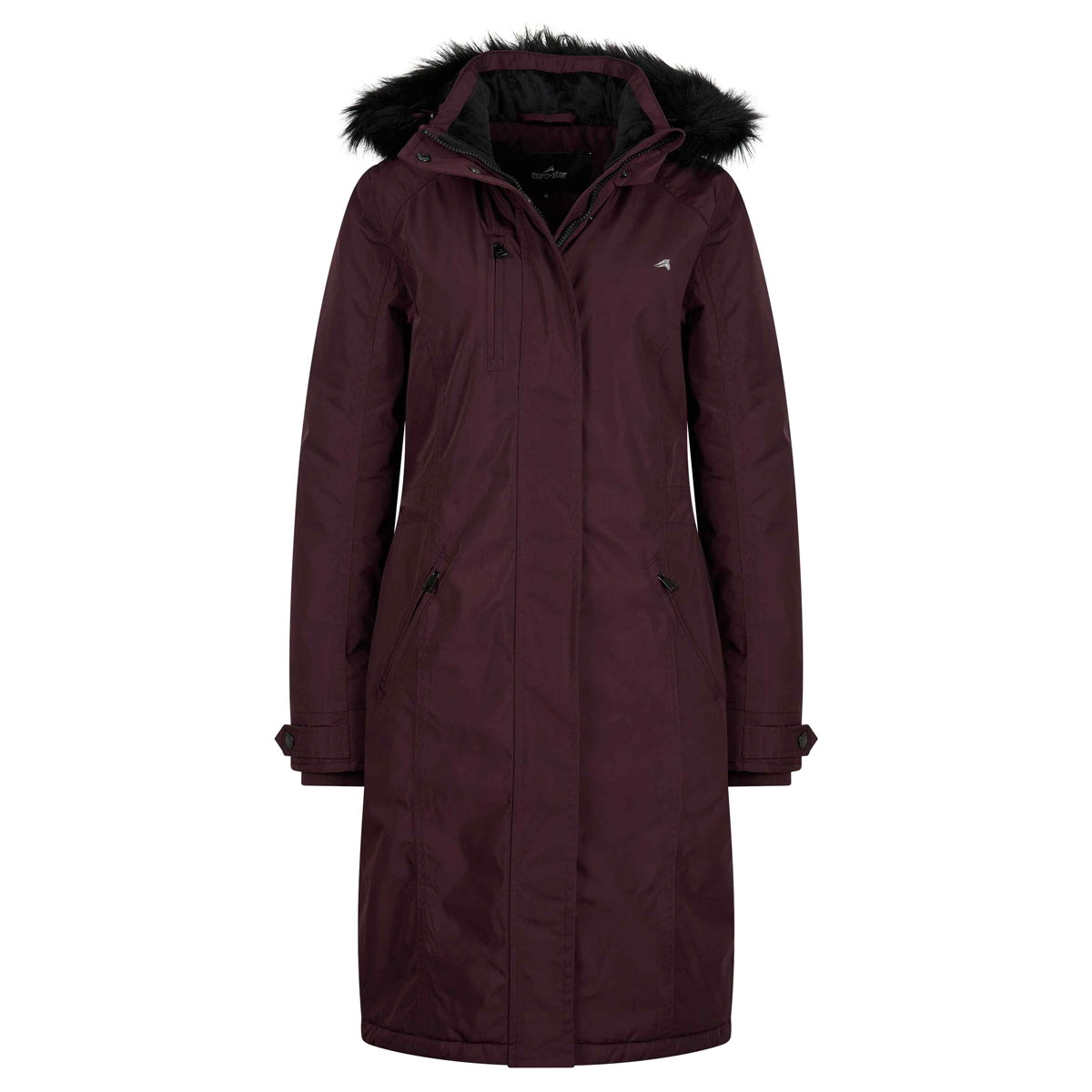 Ветро- и водонепроницаемое женское пальто La Donna имеет герметичные швы, которые не пропускают влагу и ветер. Спереди по центру расположена двусторонняя молния с защитой подбородка. Боковые карманы на молнии спереди расположены на уровне бедер. Также есть нагрудный карман на молнии. Съемный капюшон со съемным искусственным мехом - удобная дополнительная деталь. Разрез на спине, который можно гибко регулировать с помощью молнии, при необходимости обеспечивает дополнительную свободу движений в седле. Внутри есть закрывающийся внутренний карман на высоте груди. Внешняя оболочка состоит из функционального материала, изготовленного из 100% полиэстера. Подкладка состоит из смеси материалов, состоящей на 60% из полиамида (нейлона) и на 40% из полиэстера.