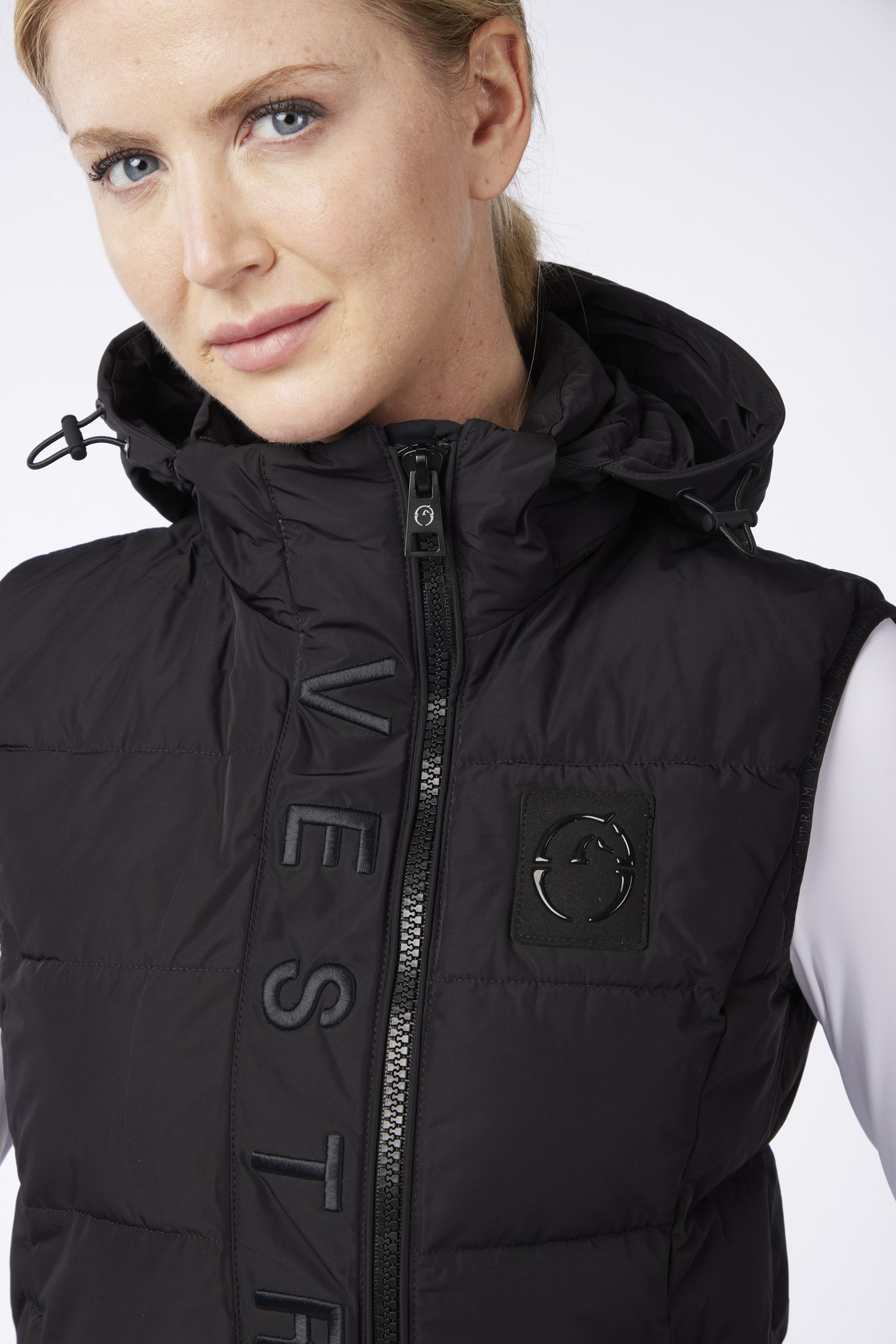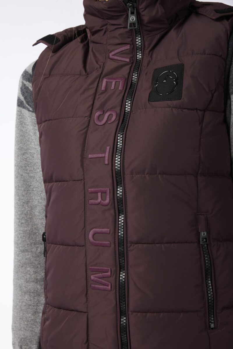 Женский водоотталкивающий и ветрозащитный жилет из нейлона с подкладкой ecodown, специальной набивкой, похожей на гусиный пух, но полностью экологически чистой. Асимметричная застежка-молния спереди и съемный капюшон. Спереди вышита надпись Vestrum в тон и нашивка с логотипом, выполненная блестящим черным цветом. Внутри есть карман с логотипом.